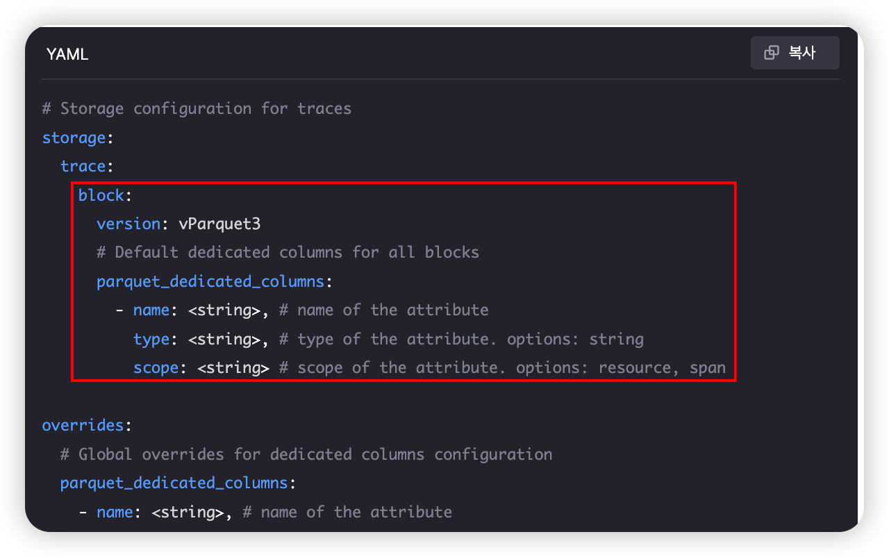 이를 통해 테넌트의 모든 블록에 대해 크기별로 상위 N개의 Attribute를 확인할 수 있으며 이를 참고하여 vParquet3의 전용 속성 컬럼을 설정할 수 있다.