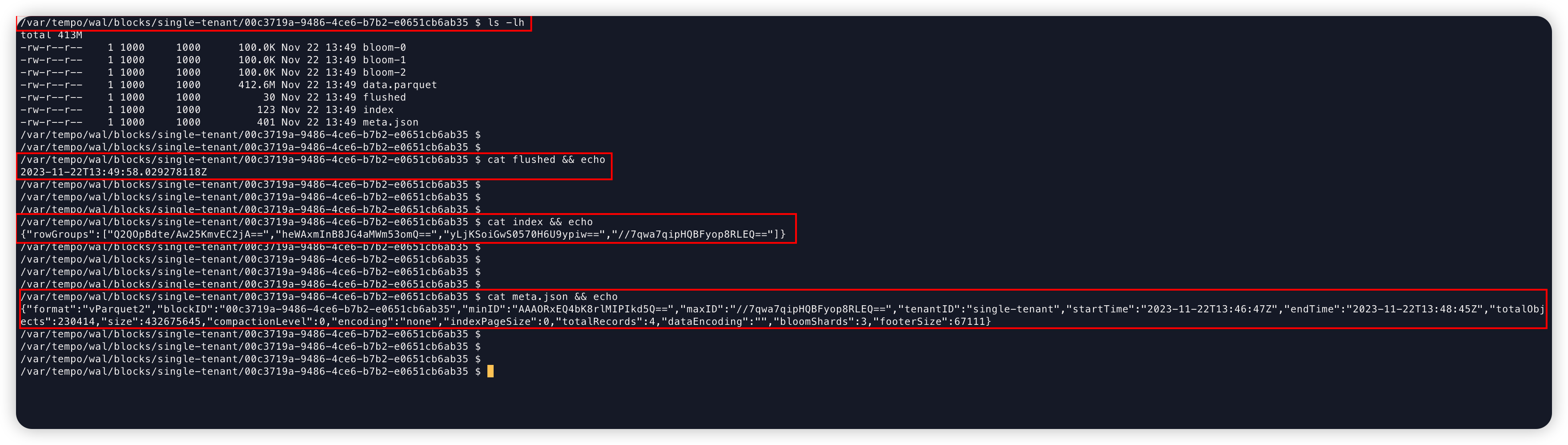 다음은 Tempo - Ingester의 wal(Write-ahead logging) 내 특정 block 폴더 안에 있는 파일들이다.