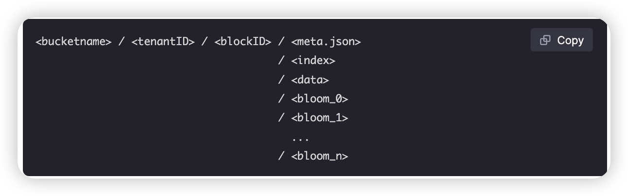 Block : Tempo에서 Trace 데이터를 저장하는 기본 단위이다. 각 Block은 시간에 따라 시간 범위의 데이터를 담고 있다.