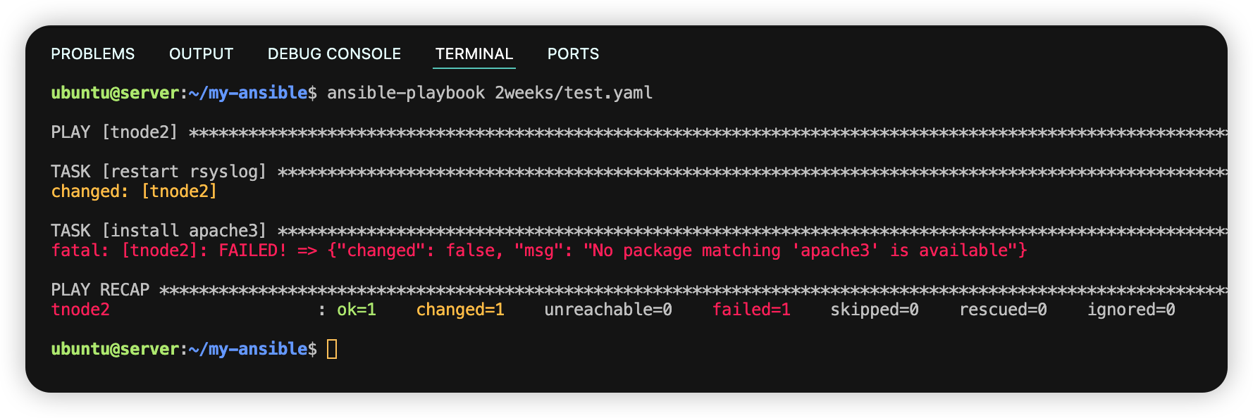 force_handlers 키워드가 없다면 rsyslog를 정상적으로 재시작했음에도 불구하고 install apache3 task가 실패함으로 인해 handler가 호출이 되지 않는다.