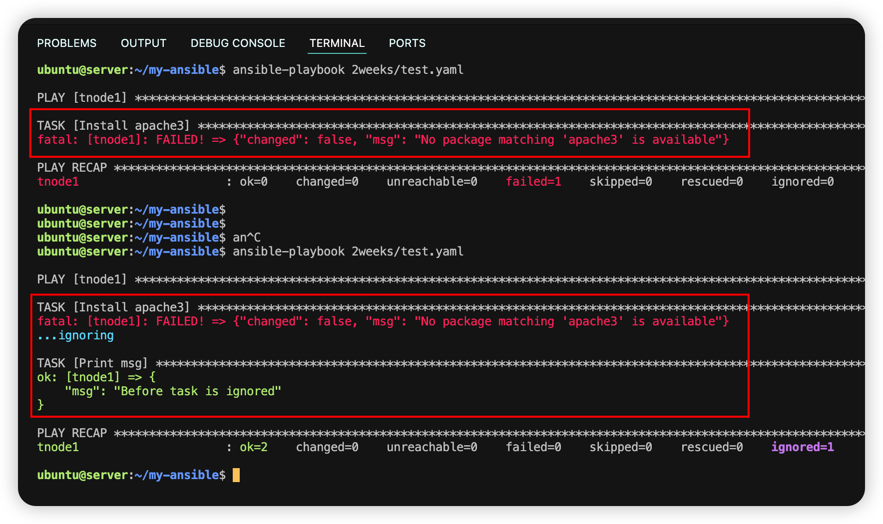 아래 예시는 ignore_errors란 키워드를 통해 에러가 발생해도 다음 task를 수행할 수 있게 된다.