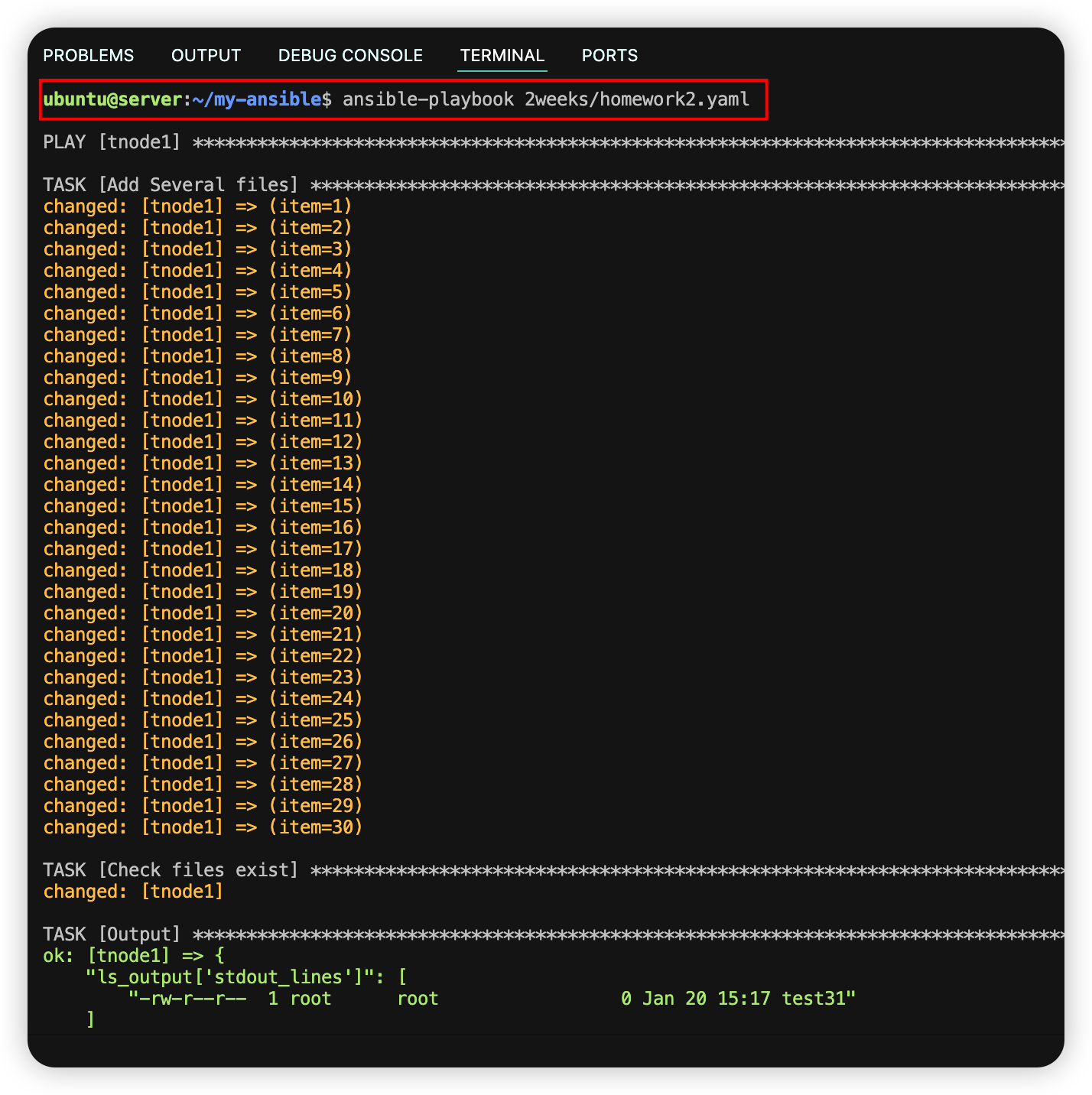 2. loop 반복문 중 sequence 를 이용하여 /var/log/test1 ~ /var/log/test100 100개 파일(file 모듈)을 생성 확인 후 삭제를 해보자
