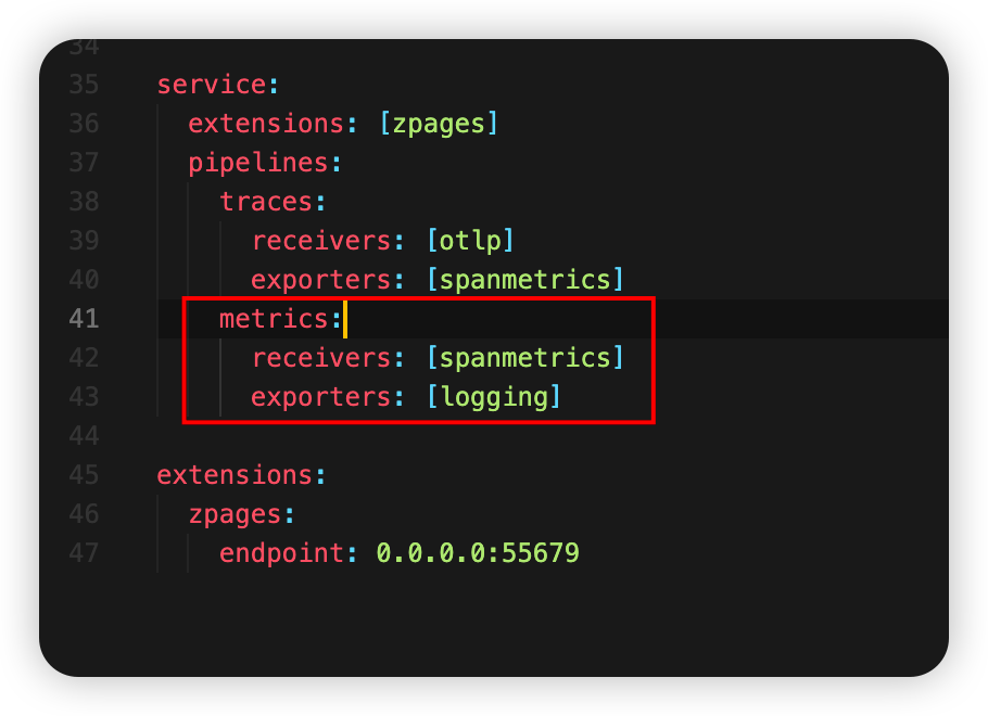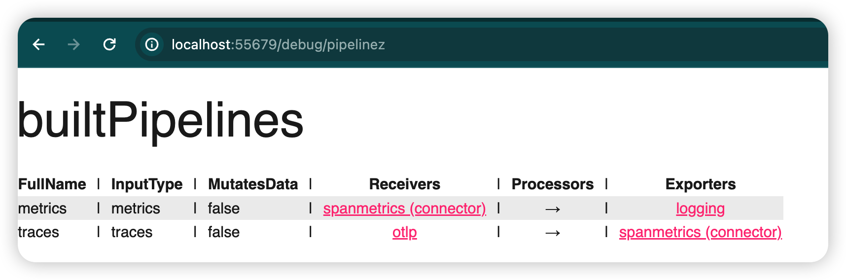 - metrics : spanmetrics(connector type receiver) -> logging(exporter)