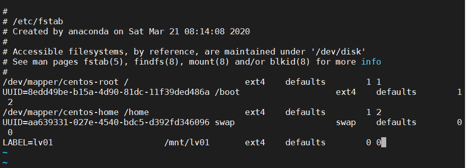 - mount LABEL=lv01