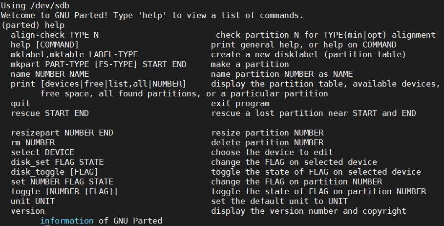 Welcome to GNU Parted! Type 'help' to view a list of commands.