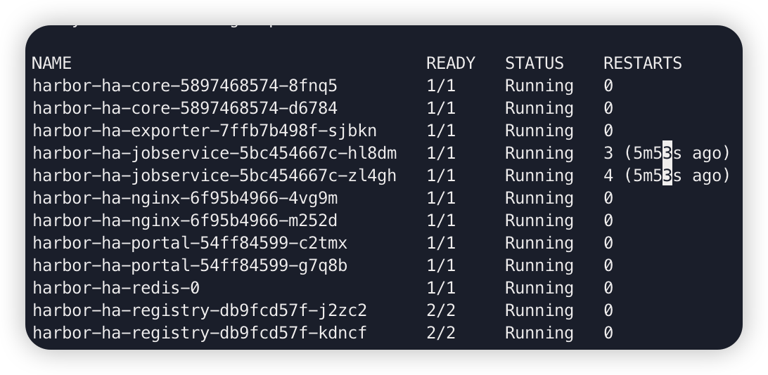 jobservice는 core가 뜨기전에 붙으려하면 crashLoopBack이 뜨는데 Restart는 크게 상관쓰지 않아도 된다.