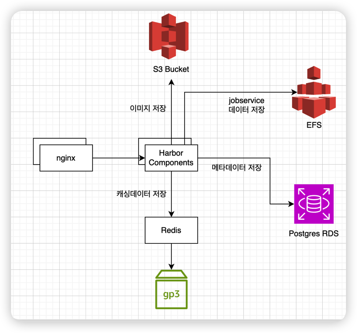 Database(postgres)는 RDS를 사용하면 별도의 걱정없이 메타데이터들을 관리할 수 있을 것이라고 생각한다. 즉 Harbor에서는 external DB에 RDS 설정을 적용하면 될 것이다.