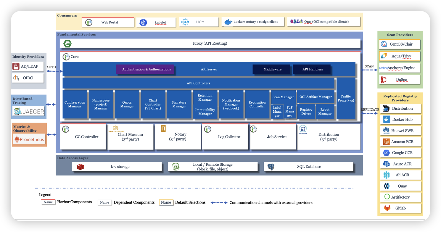[4] Core : Harbor의 핵심 서비스로써 API 서버, 설정, 프로젝트, Quota(할당량), Retention(저장기간), Replication(복제), Notification(알람), OCI Artifact, Registry Driver 등에 대한 역할을 수행한다.