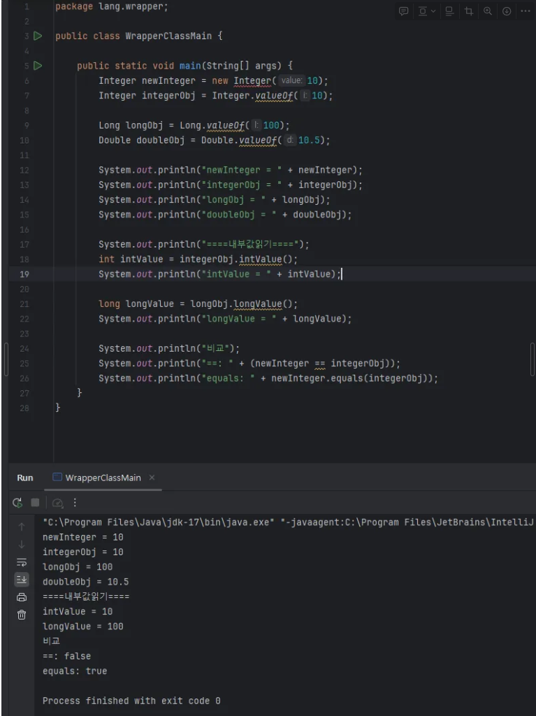 - 래퍼 클래스는 객체를 그대로 출력해도 내부에 있는 값을 문자로 출력하도록 toString()을 오버라이딩했다.