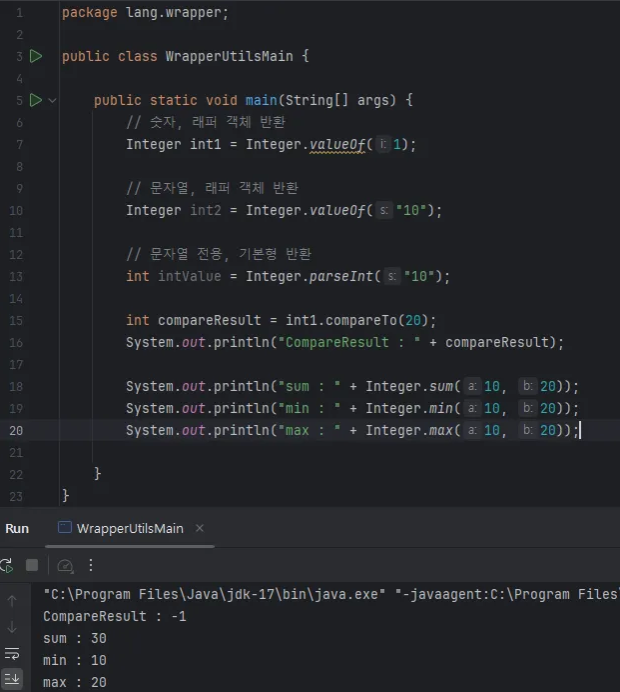 - Integer.sum() , Integer.min() , Integer.max() : Static 메서드이다. 간단한 덧셈, 작은 값, 큰 값 연산을 수행한다.