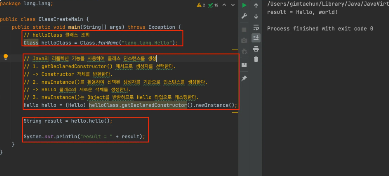 - 동적 로딩과 생성 : Class.forName() 메서드를 사용하여 클래스를 동적으로 로드하고, newInstance() 메서드를 통해 새로운 인스턴스를 생성할 수 있다.