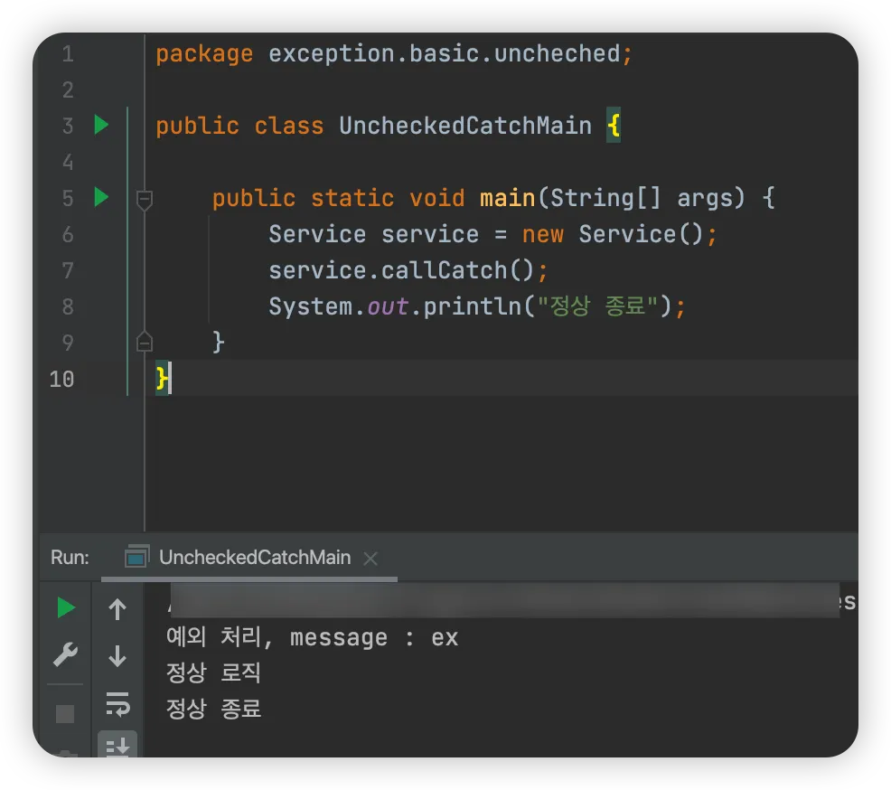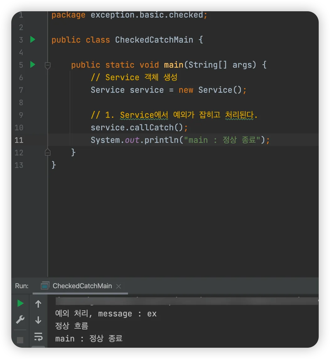 - Service.callThrows() 메서드에서 예외를 처리하지 않고 밖으로 던졌기 때문에 main() 메서드까지 올라온다.