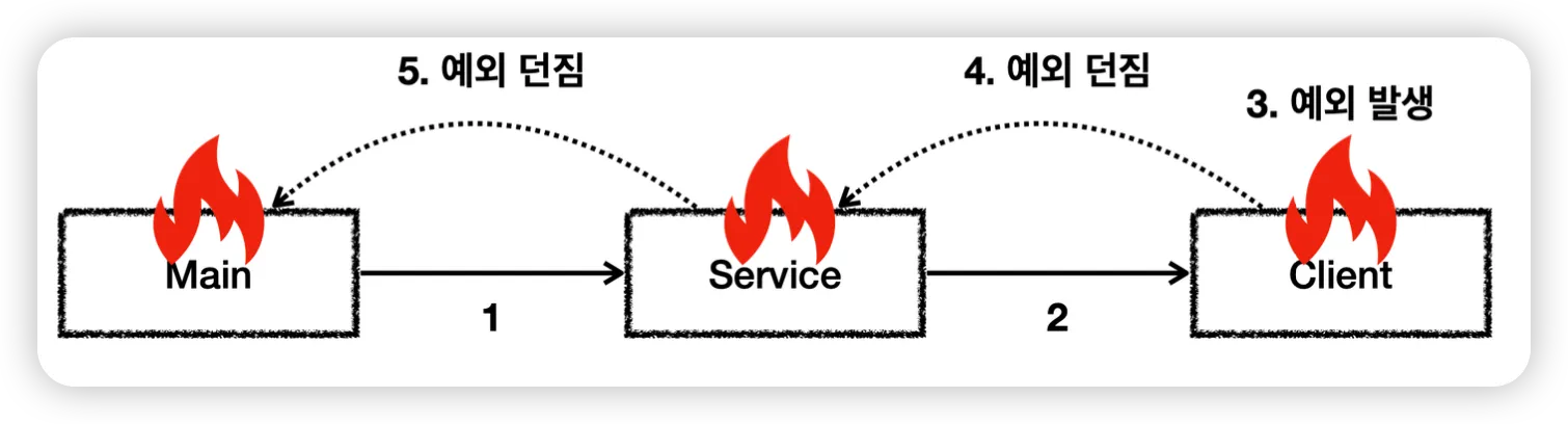 [4] Client에서 예외를 처리하지 못하고 밖으로 던진다. →여기서 Client의 밖은 Client를 호출한 Service를 뜻한다.