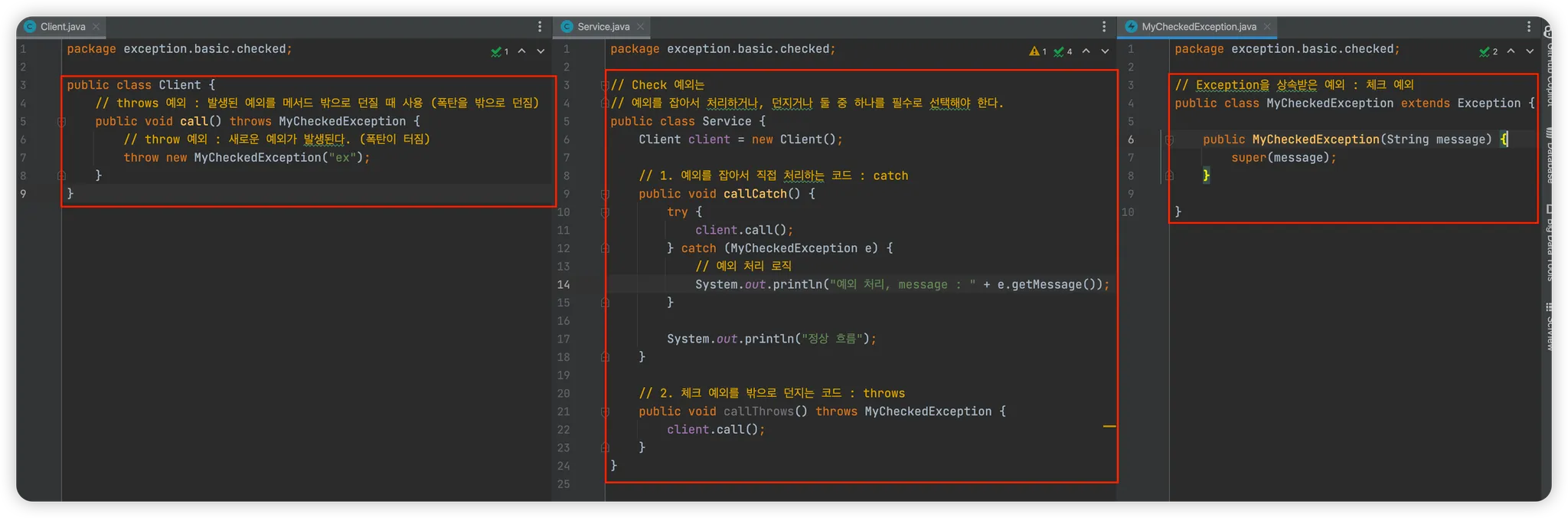 체크 예외는 발생한 예외를 개발자가 명시적으로 처리해야 한다. 그렇지 않으면 컴파일 오류가 발생한다.