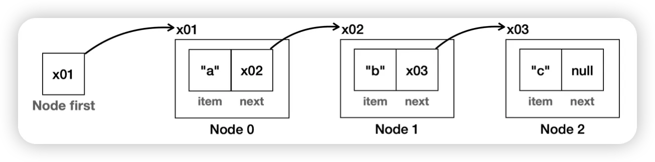 for (Node<E> x = first; x != null; x = x.next) {