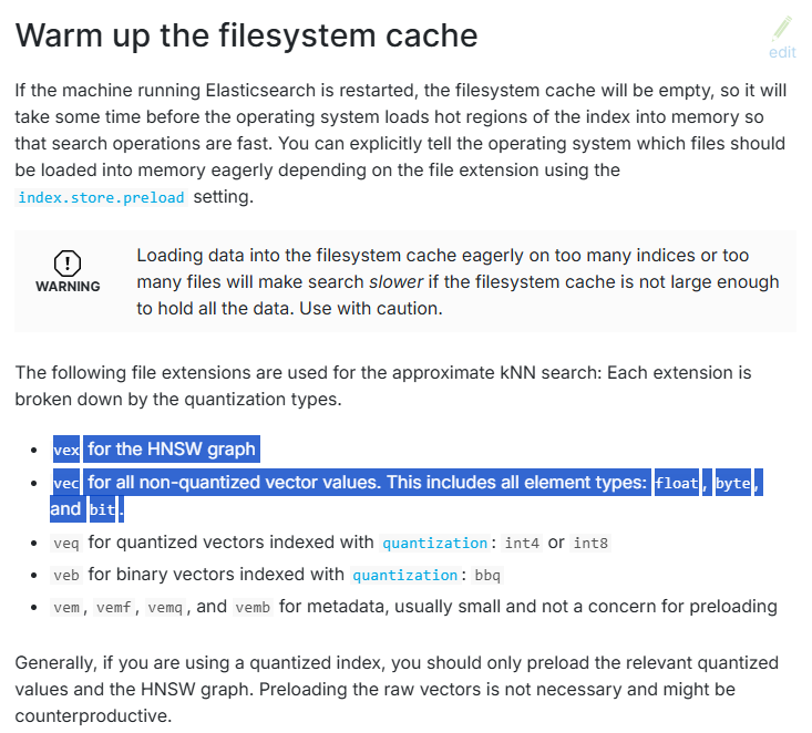 따라서 ES가 재시작될 때 미리 Memory 내 File system cache로 laod 할 수 있는 방법이 있는지 확인해보던 와중 다음의 설정을 확인했다.