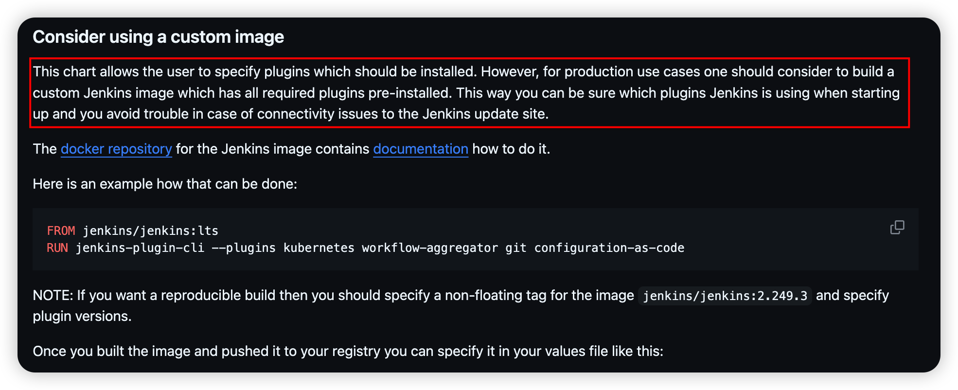 : 미리 Plugin이 설치된 Jenkins Image를 빌드하여 해당 Image를 Controller 이미지로 활용하는게 좋다고 한다. 그 이유는 Pod가 부팅될 때 Plugin을 설치하는 것이 아니라 미리 이미지를 빌드할 때 설치해두면 좀 더 안전하다는 이유인 것 같다.