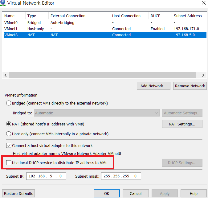 Change ~~ -> 'use local DHCP server to distribute IP address to VMs' 체크 해제를 한다.