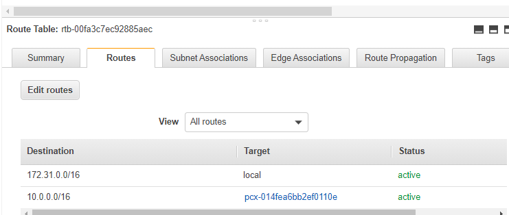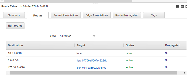 3tier-private-rt는 아래의 172.31.1.0/24 서브넷 대역을 가진 인스턴스들에 대해 적용이 되며, 10.0.0.0/16으로 가는 Packet들의 타겟을 pcx-blahblah로 보냄을 정의해준다.