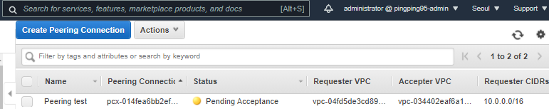 Seoul 리전에서 Create Peering Connection을 진행해준다.