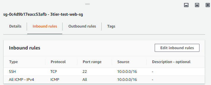 - Virginia에서 Security Group을 하나 생성해준 후 SSH, ICMP 타입에 대해서만 10.0.0.0/16 Source IP 대역을 허용해주었다.