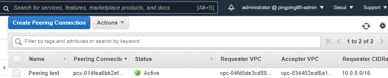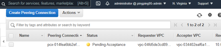 - Virginia 리전에서 Accept Request를 클릭하면 피어링이 성공한다.