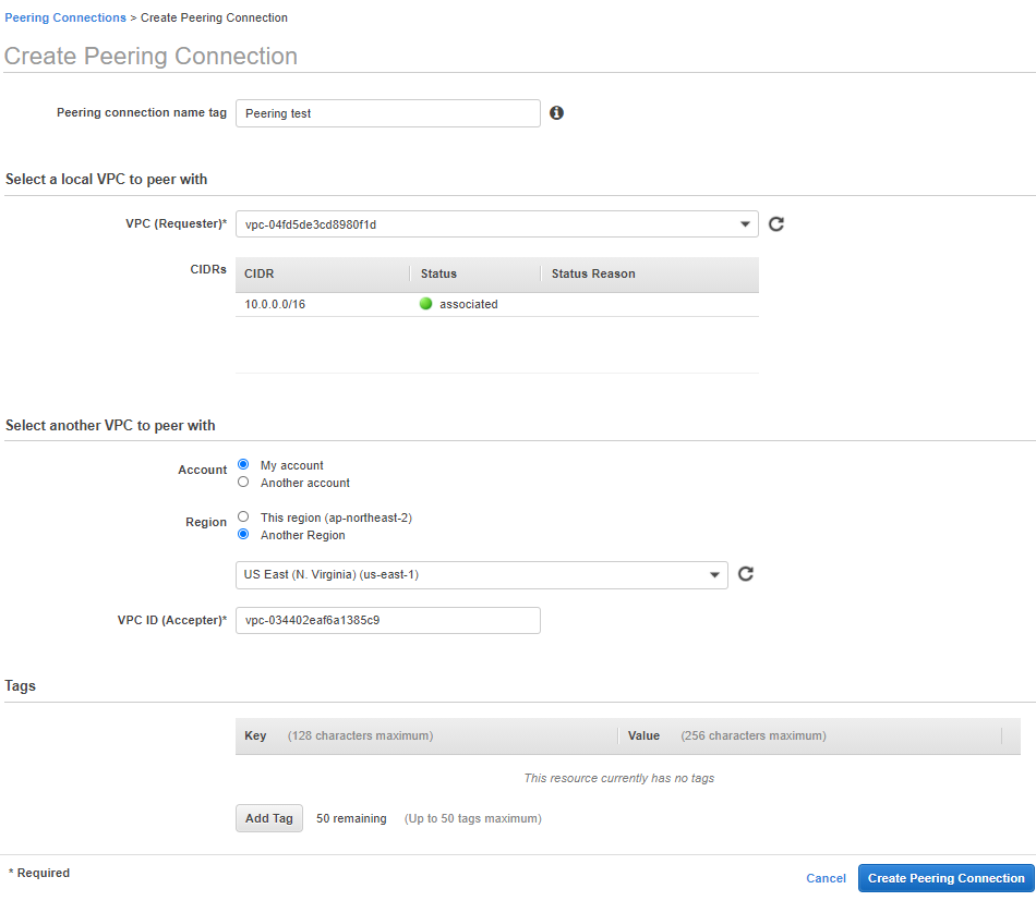 ⇒ Virginia에 있는 VPC와 맺을 것이므로 Another Region 선택