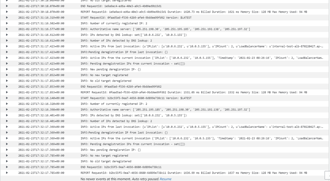 - 1분 주기로 Lambda 함수가 ALB의 IP 주소를 체크하는 것을 확인할 수 있다.