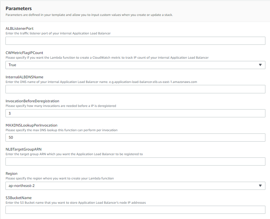 - INVOCATIONS_BEFORE_DEREGISTRATION : IP 주소가 등록해지 되기 위해 필요한 실행 횟수. 기본 값은 CloudFormation 템플릿에서3회