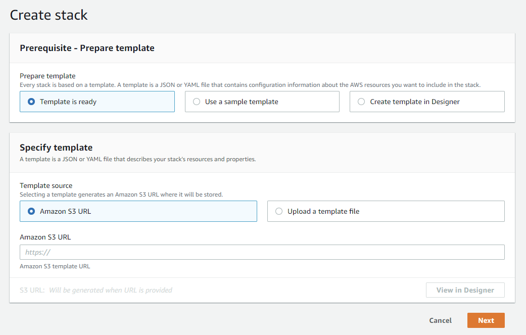 - Stack을 생성하며, 'Upload a template file'을 생성한다.