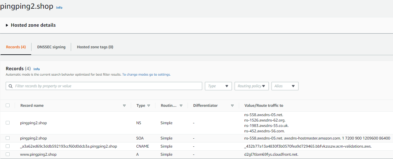 - Route 53에서 pingping2.shop Hosted Zone에 대해 A Record에서 Traffic을 CloudFront로 보냄