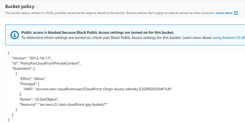 - S3 Bucket 'test-cloudfront-jpg-bucket'의 Bucket Policy는 아래와 같이 설정되어 있다.