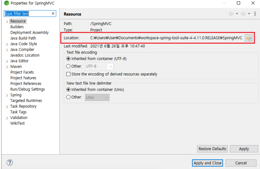 : 프로젝트 우클릭 → Location 클릭