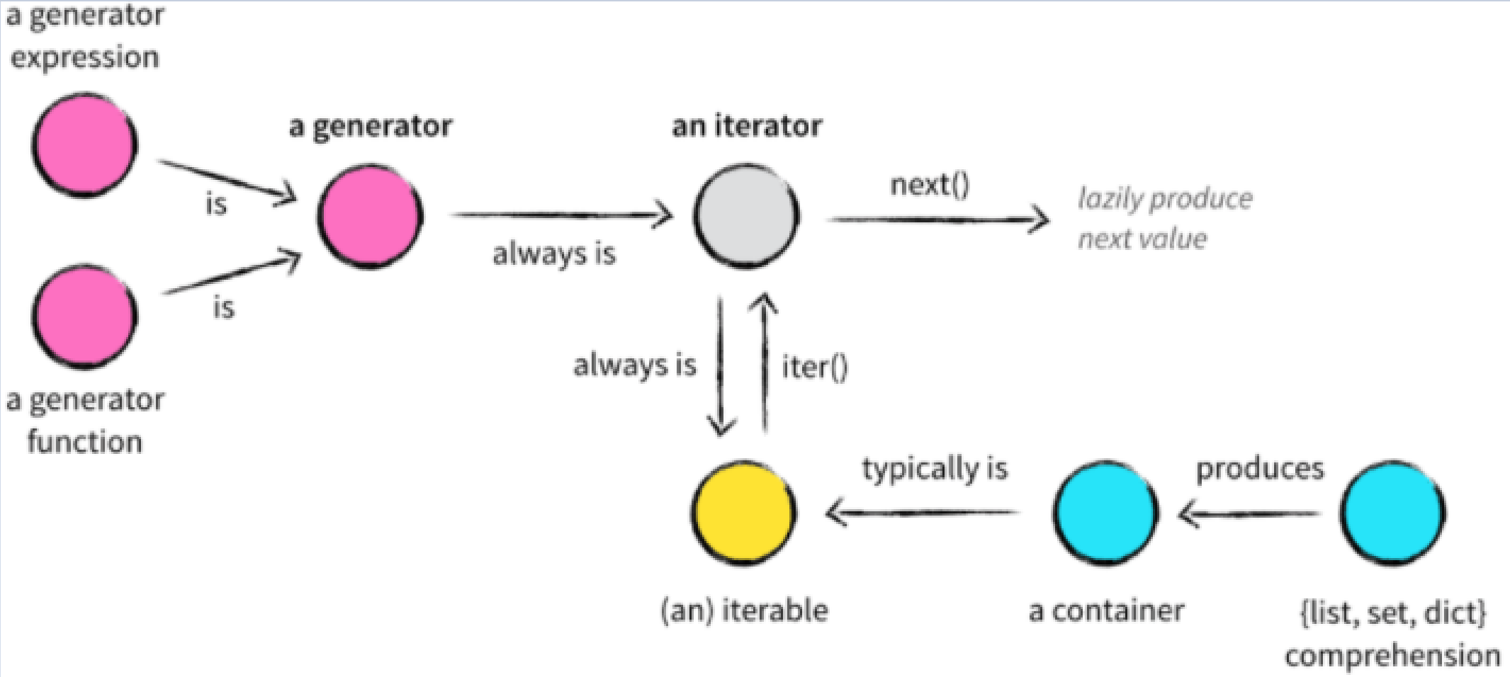 : 대부분의 컨테이너는 Iterable(반복 가능한)이다. 그러나 더 많은 것들 또한 이터레이블이다. 일례로 파일 열기, 소켓 열기 등이다. 컨테이너가 일반적으로 유한할 경우, 이터레이블은 무한한 데이터 소스를 나타낼 수도 있다.