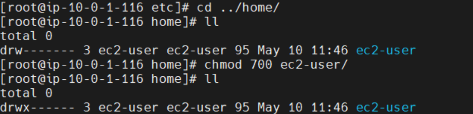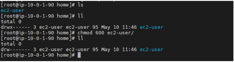- 'A' 인스턴스의 ec2-user 디렉터리의 권한을 600으로 고의로 수정