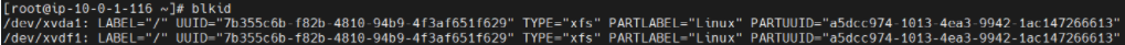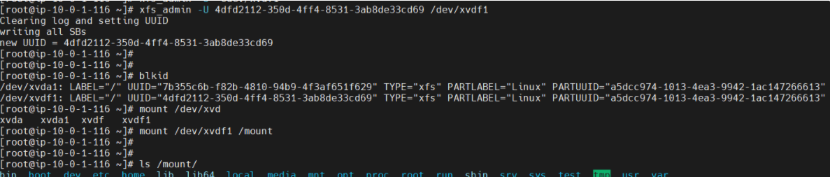 - 만약 다른 인스턴스의 Root Volume과 떼어낸 Volume의 UUID가 같을 경우, mount를 할 때 오류가 발생할 수 있다. 아래 blkid 명령어로 확인해 본 결과 UUID가 같았다