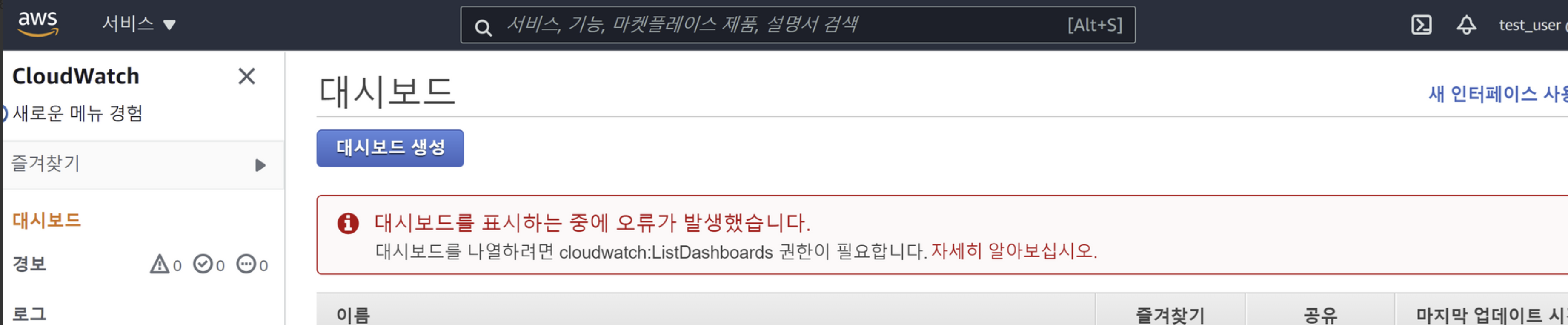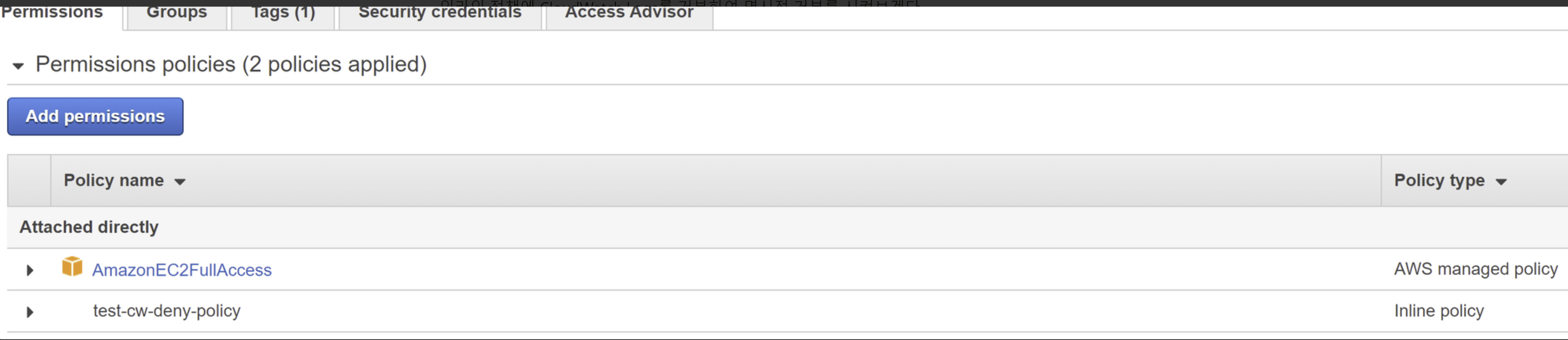 ⇒ 명시적 거부가 있는 경우, 허용된 정책 권한이 있더라도 우선시함. test_user는 EC2FullAccess 권한으로 Cloudwatch에 대한 권한을 가지고 있지만, 사용자에 인라인정책을 적용하여 명시적 접근 거부 정책으로 Cloudwatch에 대한 접근을 제어할 수 있게 된다.