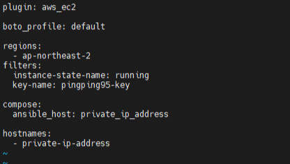 filters 기능을 통해 running 중이며, key 이름이 pingping95-key를 가진 EC2만 동적 인벤터리에 추가될 것으로 예상할 수 있다.