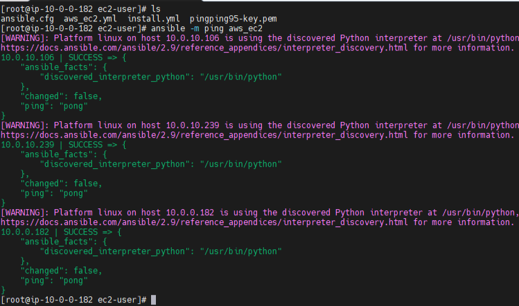aws_ec2 그룹으로 설정된 EC2에 대해 ping 모듈을 사용하는 ad-hoc 명령어 수행 결과 3대의 EC2에게만 ping 모듈을 사용한 것을 확인할 수 있다.