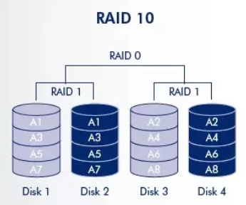 5. RAID 1+0 // 미러링 방식을 스트라이핑 함 // 최소 4개 이상의 하드디스크 요구