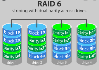 4. RAID 6 // 2개의 패리티 방식 // 최소 4개 이상의 하드디스크 요구