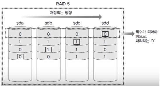 - 2개 이상 고장난다면 RAID 5는 복구 불가.