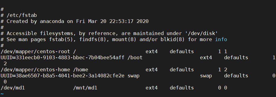 - /dev/md1 /mnt/md1 ext4 defaults 0 0