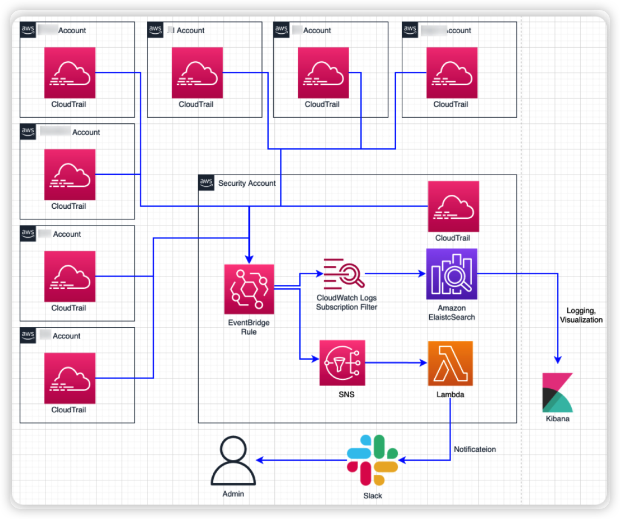 IAM Audit 내역을 중앙에서 수집하고, 중앙에서 수집한 뒤 1) Lambda를 활용한 Slack Notification, 2) OpenSearch를 활용한 Logging 중앙화 및 시각화